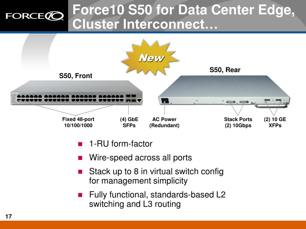 Force10 S50 for Data Center Edge, Cluster Interconnect… New • 1-RU form-factor • Wire-speed across all ports • Stack up to 8 in virtual switch config for management simplicity • Fully functional, standards-based L2 switching and L3 routing S50, Rear S50, Front Fixed 48-port 10/100/1000 (4) GbE SFPs AC Power (Redundant) Stack Ports (2) 10Gbps (2) 10 GE XFPs
