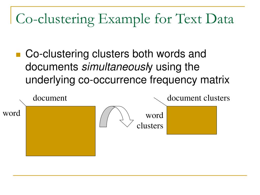 Co-clustering Example for Text Data • Co-clustering clusters both words and documents simultaneously using the underlying co-occurrence frequency matrix document document clusters word word clusters