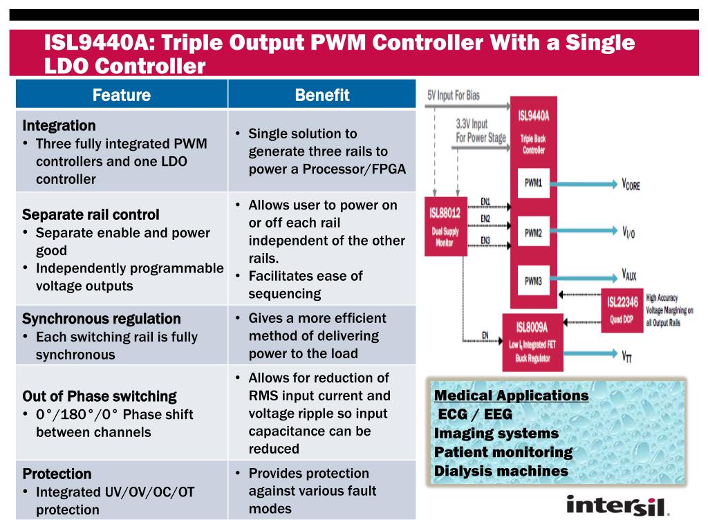 ISL9440A: Triple Output PWM Controller With a Single LDO Controller Medical Applications ECG / EEG Imaging systems Patient monitoring Dialysis machines