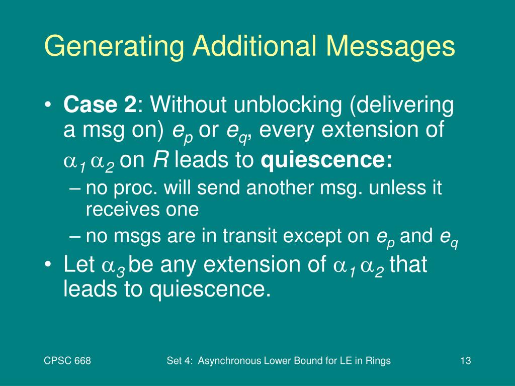 Generating Additional Messages • Case 2: Without unblocking (delivering a msg on) ep or eq, every extension of 1 2 on R leads to quiescence: • no proc. will send another msg. unless it receives one • no msgs are in transit except on ep and eq • Let 3 be any extension of 1 2 that leads to quiescence. Set 4: Asynchronous Lower Bound for LE in Rings