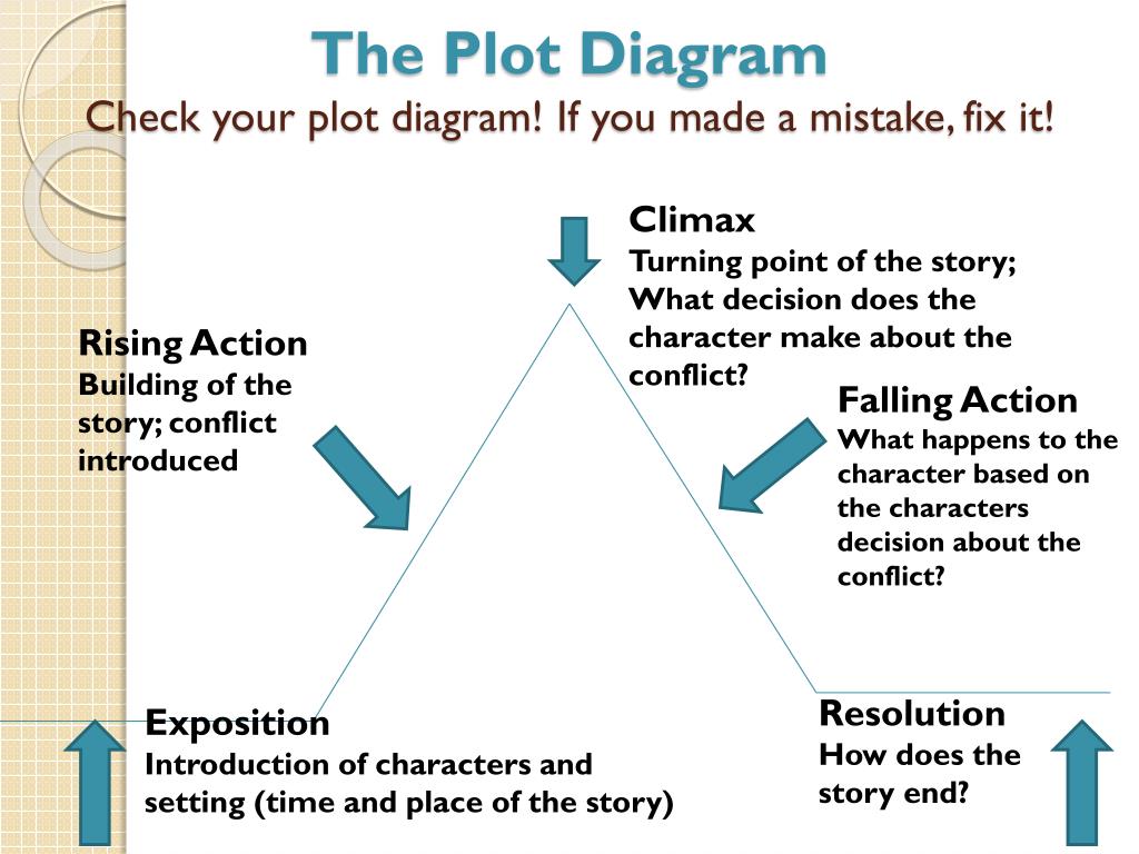 The Plot DiagramCheck your plot diagram! If you made a mistake, fix it! Climax Turning point of the story; What decision does the character make about the conflict? Rising Action Building of the story; conflict introduced Falling Action What happens to the character based on the characters decision about the conflict? Resolution How does the story end? Exposition Introduction of characters and setting (time and place of the story)