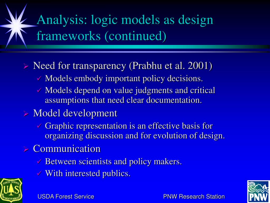 Analysis: logic models as design frameworks (continued) • Need for transparency (Prabhu et al. 2001) • Models embody important policy decisions. • Models depend on value judgments and critical assumptions that need clear documentation. • Model development • Graphic representation is an effective basis for organizing discussion and for evolution of design. • Communication • Between scientists and policy makers. • With interested publics.
