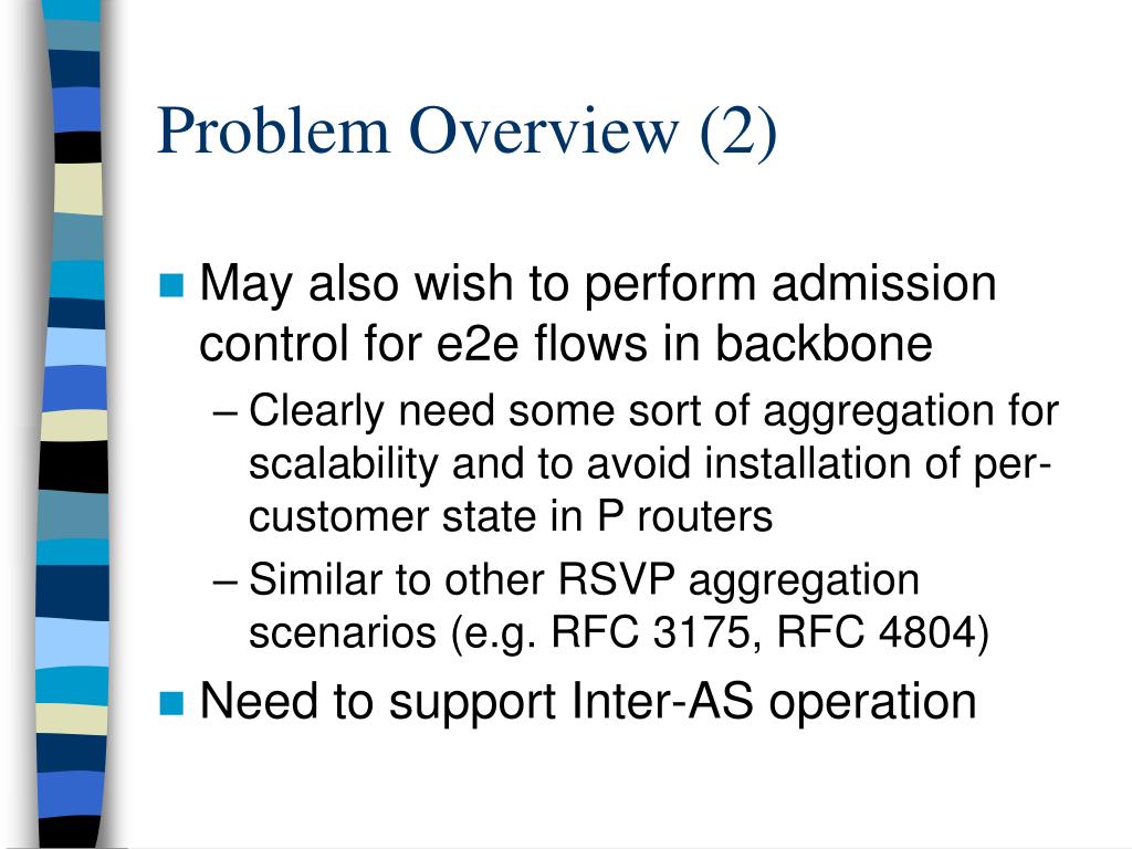 Problem Overview (2) • May also wish to perform admission control for e2e flows in backbone • Clearly need some sort of aggregation for scalability and to avoid installation of per-customer state in P routers • Similar to other RSVP aggregation scenarios (e.g. RFC 3175, RFC 4804) • Need to support Inter-AS operation