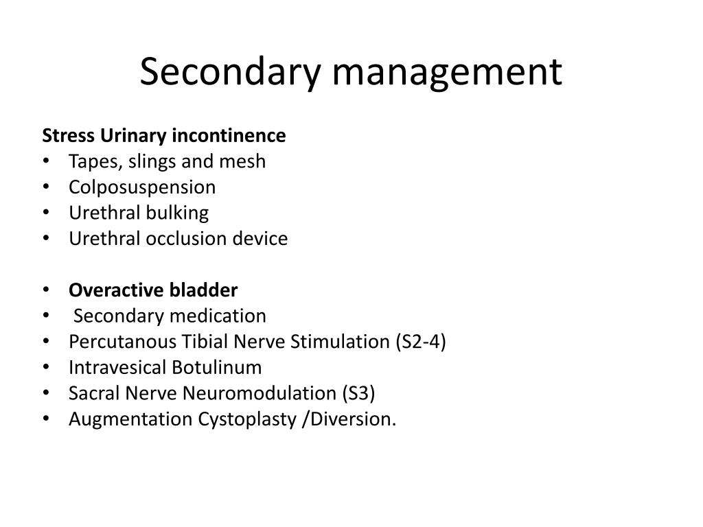 Secondary management Stress Urinary incontinence • Tapes, slings and mesh • Colposuspension • Urethral bulking • Urethral occlusion device • Overactive bladder • Secondary medication • PercutanousTibial Nerve Stimulation (S2-4) • Intravesical Botulinum • Sacral Nerve Neuromodulation (S3) • Augmentation Cystoplasty /Diversion.