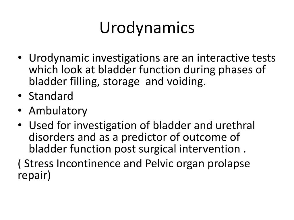 Urodynamics • Urodynamic investigations are an interactive tests which look at bladder function during phases of bladder filling, storage and voiding. • Standard • Ambulatory • Used for investigation of bladder and urethral disorders and as a predictor of outcome of bladder function post surgical intervention . ( Stress Incontinence and Pelvic organ prolapse repair)