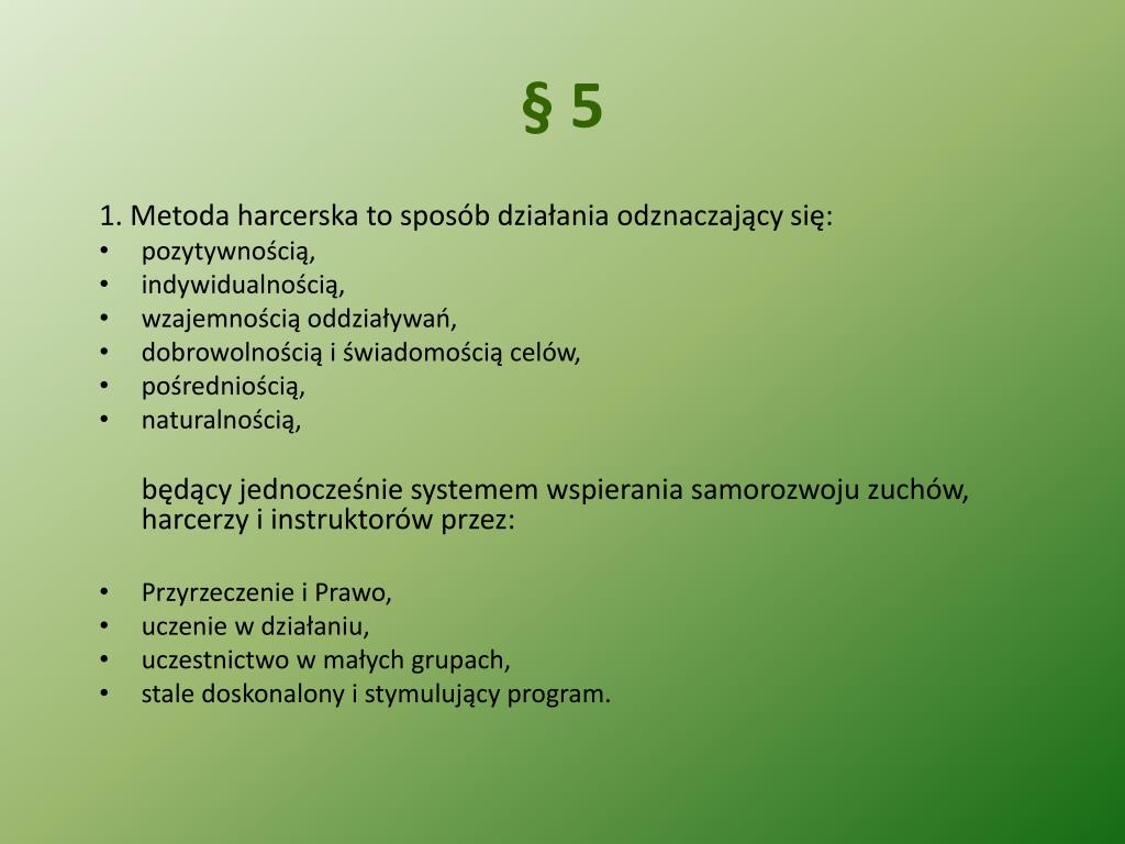 § 5 1. Metoda harcerska to sposób działania odznaczający się: • pozytywnością, • indywidualnością, • wzajemnością oddziaływań, • dobrowolnością i świadomością celów, • pośredniością, • naturalnością, będący jednocześnie systemem wspierania samorozwoju zuchów, harcerzy i instruktorów przez: • Przyrzeczenie i Prawo, • uczenie w działaniu, • uczestnictwo w małych grupach, • stale doskonalony i stymulujący program.