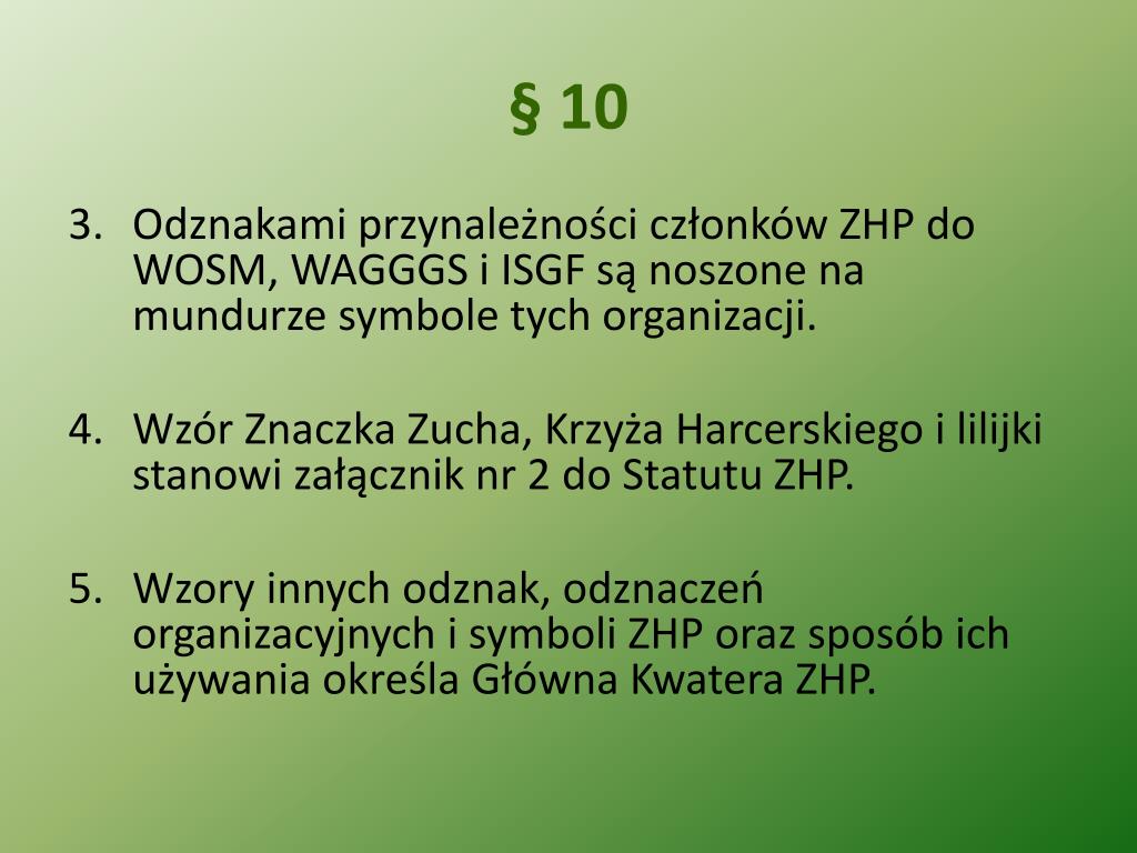 § 10 • Odznakami przynależności członków ZHP do WOSM, WAGGGS i ISGF są noszone na mundurze symbole tych organizacji. • Wzór Znaczka Zucha, Krzyża Harcerskiego i lilijki stanowi załącznik nr 2 do Statutu ZHP. • Wzory innychodznak, odznaczeń organizacyjnych i symboli ZHP oraz sposób ich używania określa Główna Kwatera ZHP.