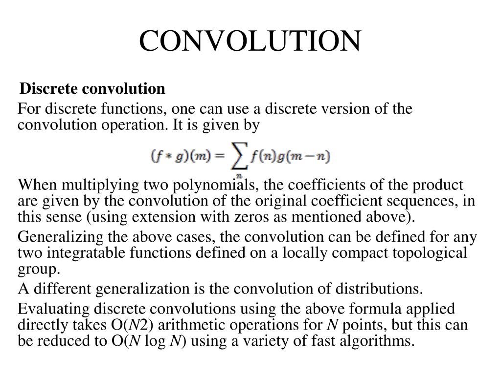 CONVOLUTION Discrete convolution For discrete functions, one can use a discrete version of the convolution operation. It is given by When multiplying two polynomials, the coefficients of the product are given by the convolution of the original coefficient sequences, in this sense (using extension with zeros as mentioned above). Generalizing the above cases, the convolution can be defined for any two integratable functions defined on a locally compact topological group. A different generalization is the convolution of distributions. Evaluating discrete convolutions using the above formula applied directly takes O(N2) arithmetic operations for N points, but this can be reduced to O(N log N) using a variety of fast algorithms.
