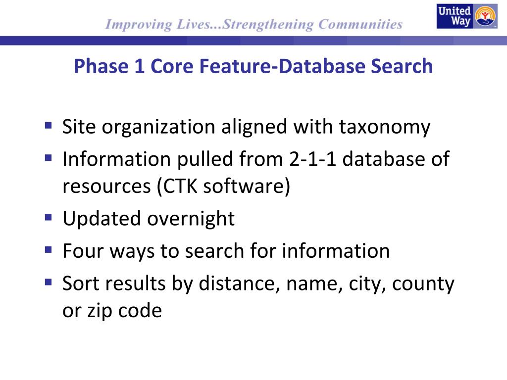 Phase 1 Core Feature-Database Search • Site organization aligned with taxonomy • Information pulled from 2-1-1 database of resources (CTK software) • Updated overnight • Four ways to search for information • Sort results by distance, name, city, county or zip code