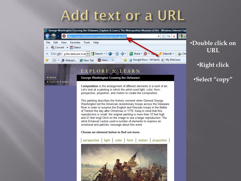 Add text or a URL • Double click on URL • Right click • Select “copy”