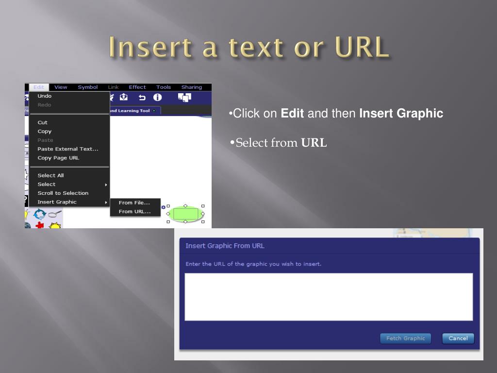 Insert a text or URL • Click on Edit and then Insert Graphic • Select from URL