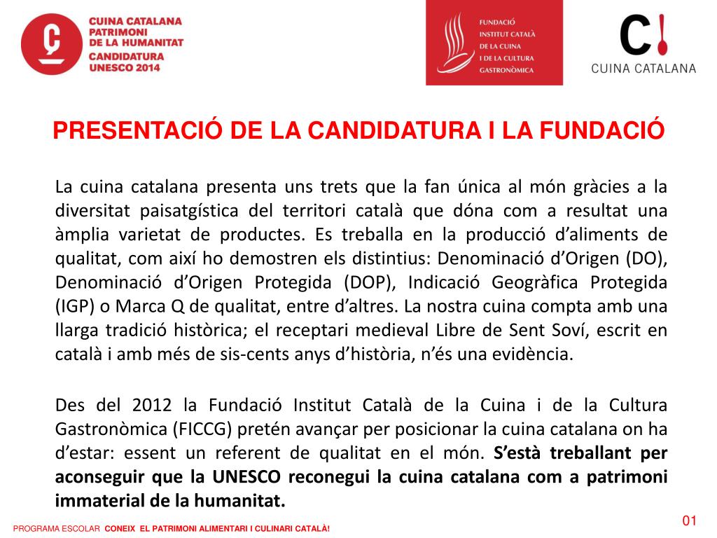 PROGRAMA ESCOLAR CONEIX EL PATRIMONI ALIMENTARI I CULINARI CATALÀ!. PRESENTACIÓ DE LA CANDIDATURA I LA FUNDACIÓ.