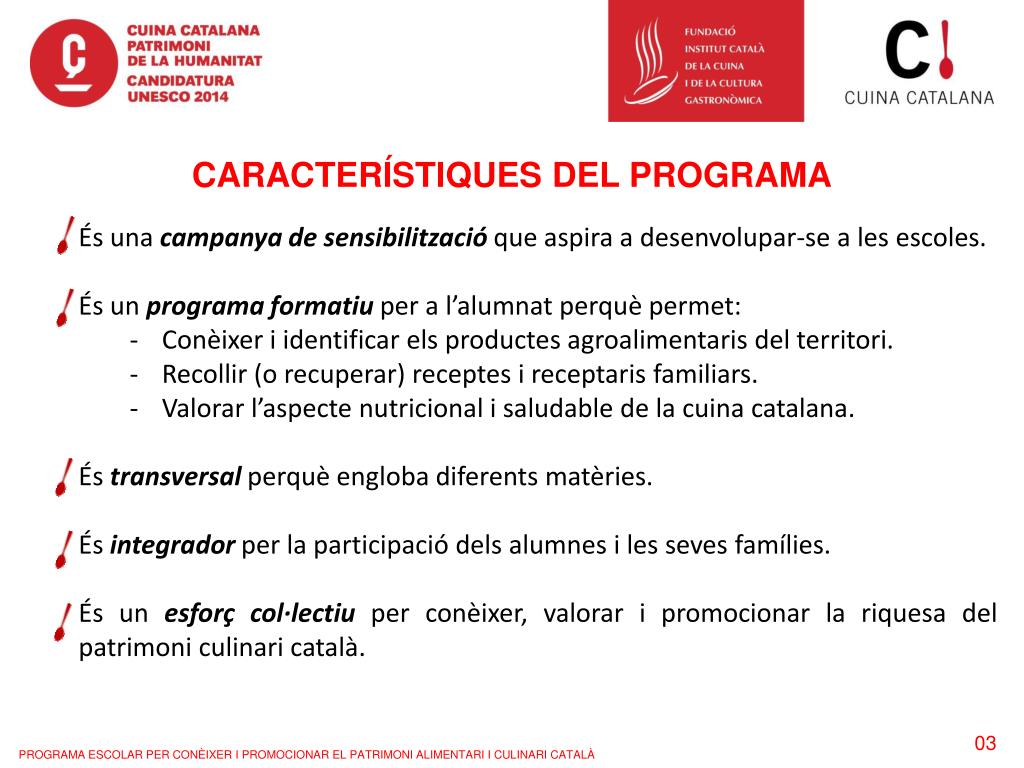 CARACTERÍSTIQUES DEL PROGRAMA • És una campanya de sensibilització que aspira a desenvolupar-se a les escoles. • És un programa formatiu per a l’alumnat perquè permet: • Conèixer i identificar els productes agroalimentaris del territori. • Recollir (o recuperar) receptes i receptaris familiars. • Valorar l’aspecte nutricional i saludable de la cuina catalana. • És transversal perquè engloba diferents matèries. • És integrador per la participació dels alumnes i les seves famílies. • És un esforç col·lectiu per conèixer, valorar i promocionar la riquesa del patrimoni culinari català. 03 PROGRAMA ESCOLAR PER CONÈIXER I PROMOCIONAR EL PATRIMONI ALIMENTARI I CULINARI CATALÀ