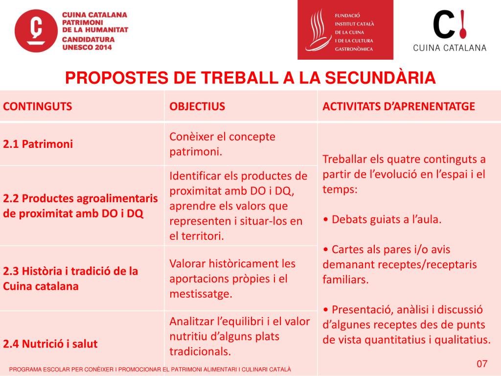 PROPOSTES DE TREBALL A LA SECUNDÀRIA 07 PROGRAMA ESCOLAR PER CONÈIXER I PROMOCIONAR EL PATRIMONI ALIMENTARI I CULINARI CATALÀ