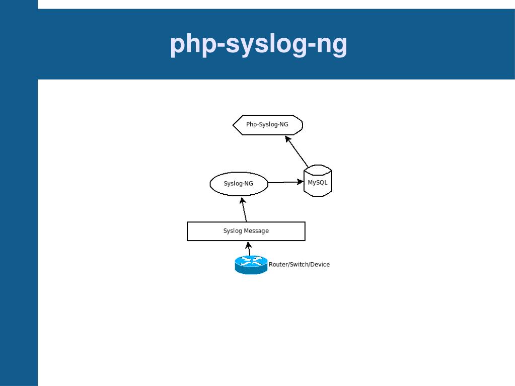 MySQL y php-syslog-ng • Una herramienta muy útil para un servidor central de syslog-ng • Inserta cada mensaje en una simple tabla MySQL • Permite hacer búsquedas basadas en diversos criterios • Nodo de origen • Rango de tiempo • Prioridad • Interfaz web