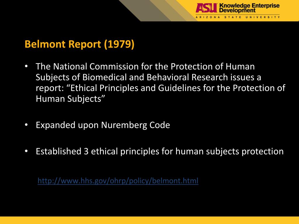 Belmont Report (1979) The National Commission for the Protection of Human Subjects of Biomedical and Behavioral Research issues a report: “Ethical Principles and Guidelines for the Protection of Human Subjects” Expanded upon Nuremberg Code Established 3 ethical principles for human subjects protection http://www.hhs.gov/ohrp/policy/belmont.html