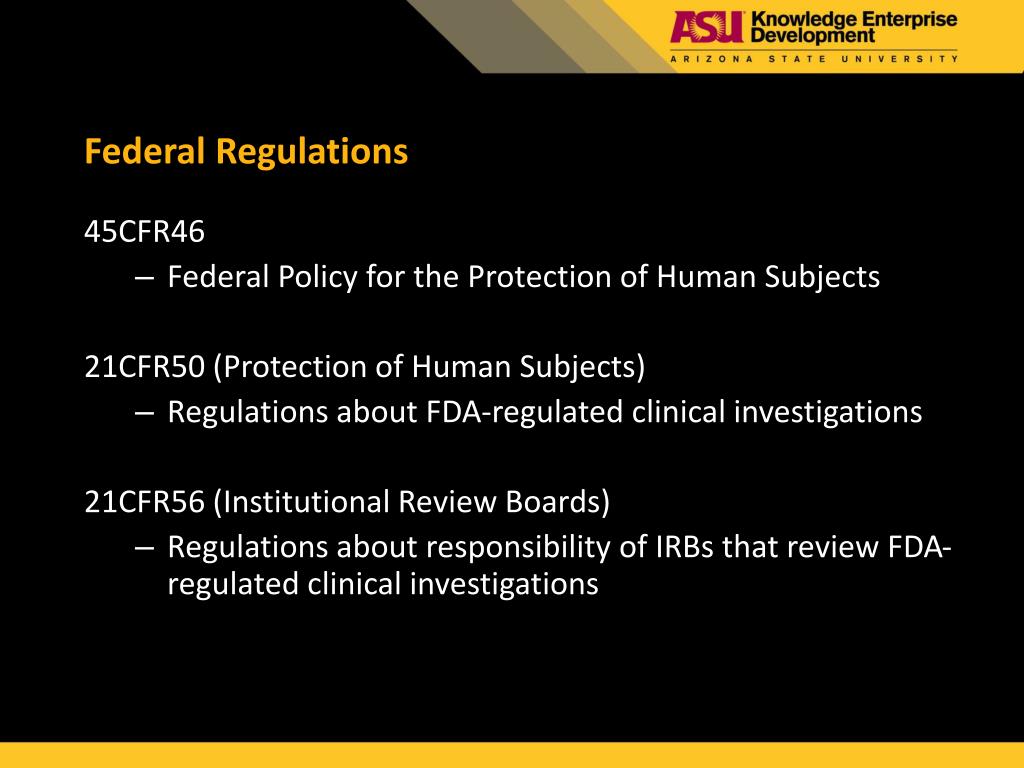 Federal Regulations 45CFR46 Federal Policy for the Protection of Human Subjects 21CFR50 (Protection of Human Subjects) Regulations about FDA-regulated clinical investigations 21CFR56 (Institutional Review Boards) Regulations about responsibility of IRBs that review FDA-regulated clinical investigations