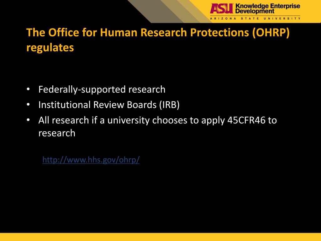 The Office for Human Research Protections (OHRP) regulates Federally-supported research Institutional Review Boards (IRB) All research if a university chooses to apply 45CFR46 to research http://www.hhs.gov/ohrp/