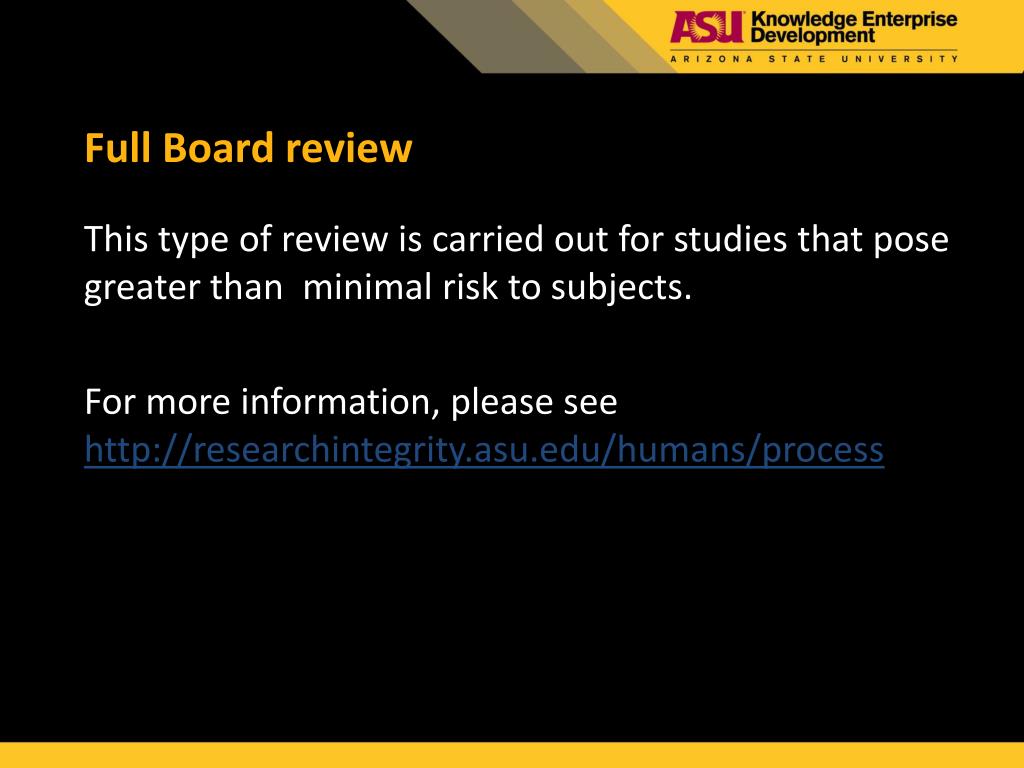 Full Board review This type of review is carried out for studies that pose greater than minimal risk to subjects. For more information, please see http://researchintegrity.asu.edu/humans/process