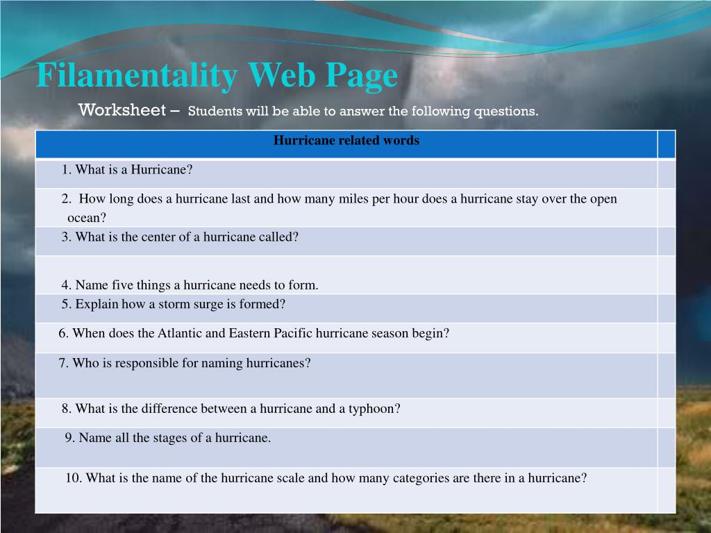 Filamentality Web Page Students will be using the Filamentality webpage during Lesson 5. During the lesson students will be working in groups of four based on their learning needs and abilities, social skills, and academic strength which is assessed prior to the lesson. They will be assigned various roles such as researcher, writer, editor, and leader. Each group will be assigned to a computer station and visit the Filamentality website: http://www.kn.att.com/wired/fil/pages/listnaturalfl.html They will be responsible for working as a team and find ten hurricane related words found on their worksheets. They have 20 minutes to scavenge online for the answers using the website links. After the scavenger hunt, the class with regroup to share their results and feelings regarding their online scavenger hunt experience.