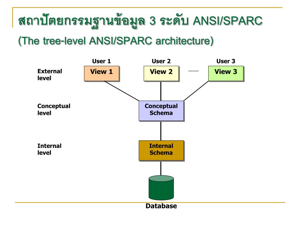 สถาปัตยกรรมฐานข้อมูล 3 ระดับ ANSI/SPARC(The tree-level ANSI/SPARC architecture) แบ่งออกเป็น 3 ระดับ • ระดับภายนอก(External level) • ระดับแนวคิด(Conceptual level) • ระดับภายใน(Internal level)