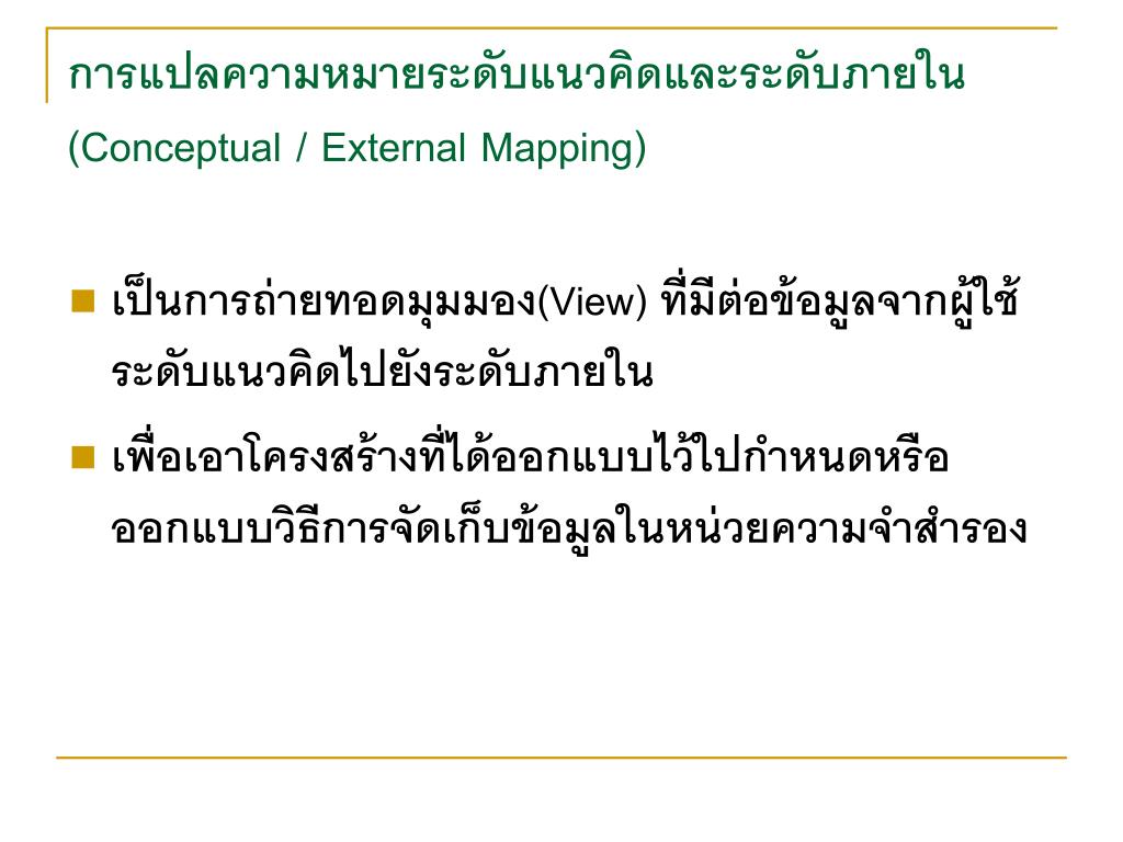 การแปลความหมายระดับแนวคิดและระดับภายใน(Conceptual / External Mapping) • เป็นการถ่ายทอดมุมมอง(View) ที่มีต่อข้อมูลจากผู้ใช้ระดับแนวคิดไปยังระดับภายใน • เพื่อเอาโครงสร้างที่ได้ออกแบบไว้ใปกำหนดหรือออกแบบวิธีการจัดเก็บข้อมูลในหน่วยความจำสำรอง