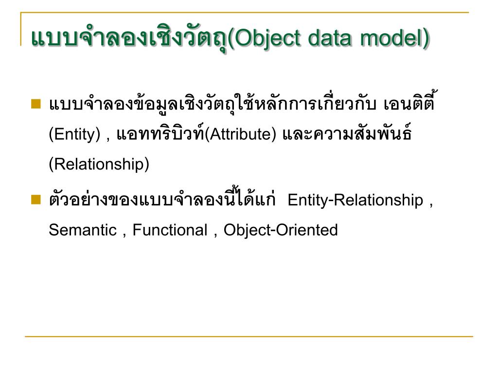 แบบจำลองเชิงวัตถุ(Object data model) • แบบจำลองข้อมูลเชิงวัตถุใช้หลักการเกี่ยวกับ เอนติตี้(Entity) , แอททริบิวท์(Attribute) และความสัมพันธ์(Relationship) • ตัวอย่างของแบบจำลองนี้ได้แก่ Entity-Relationship , Semantic , Functional , Object-Oriented