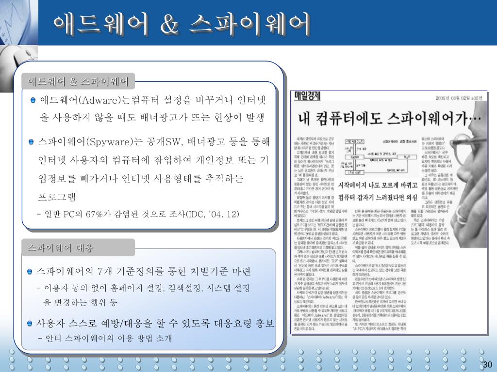 애드웨어 & 스파이웨어 애드웨어 & 스파이웨어 • 애드웨어(Adware)는컴퓨터 설정을 바꾸거나 인터넷을 사용하지 않을 때도 배너광고가 뜨는 현상이 발생 • 스파이웨어(Spyware)는 공개SW, 배너광고 등을 통해 인터넷 사용자의 컴퓨터에 잠입하여 개인정보 또는 기업정보를 빼가거나 인터넷 사용형태를 추적하는 • 프로그램 • - 일반 PC의 67%가 감염된 것으로 조사(IDC, ’04. 12) 스파이웨어 대응 • 스파이웨어의 7개 기준정의를 통한 처벌기준 마련 • - 이용자 동의 없이 홈페이지 설정, 검색설정, 시스템 설정 • 을 변경하는 행위 등 • 사용자 스스로 예방/대응을 할 수 있도록 대응요령 홍보 • - 안티 스파이웨어의 이용 방법 소개