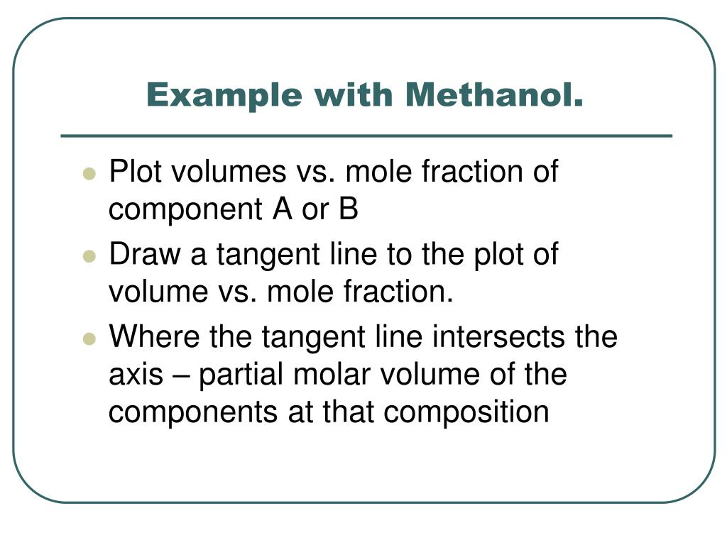 Example with Methanol. Plot volumes vs. mole fraction of component A or B Draw a tangent line to the plot of volume vs. mole fraction. Where the tangent line intersects the axis – partial molar volume of the components at that composition