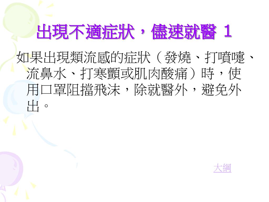 出現不適症狀,儘速就醫1 如果出現類流感的症狀(發燒、打噴嚏、流鼻水、打寒顫或肌肉酸痛)時,使用口罩阻擋飛沫,除就醫外,避免外出。 大綱