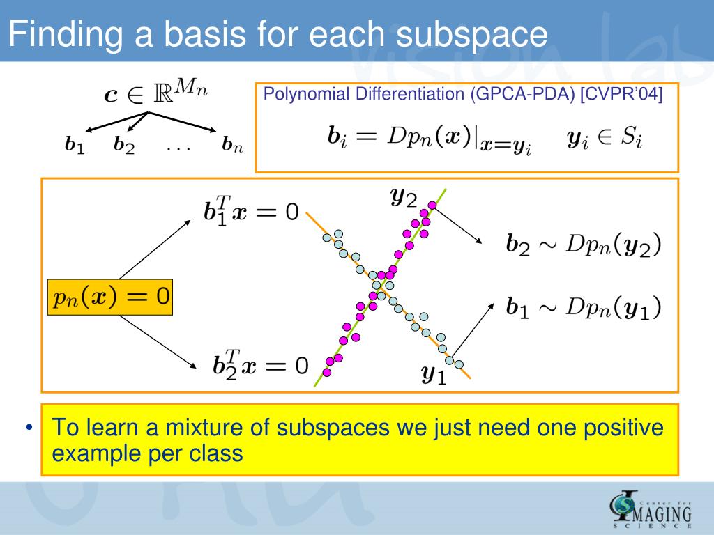 Finding a basis for each subspace • To learn a mixture of subspaces we just need one positive example per class Polynomial Differentiation (GPCA-PDA) [CVPR’04]