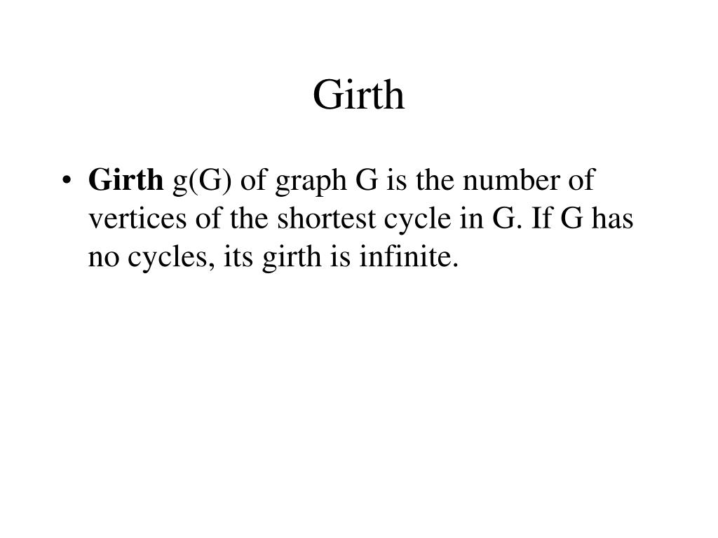 Girth • Girth g(G) of graph G is the number of vertices of the shortest cycle in G. If G has no cycles, its girth is infinite.