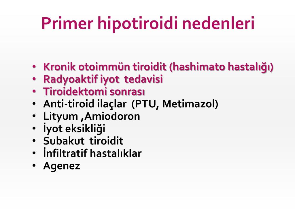 Primer hipotiroidi nedenleri • Kronik otoimmün tiroidit (hashimato hastalığı) • Radyoaktif iyot tedavisi • Tiroidektomi sonrası • Anti-tiroid ilaçlar (PTU, Metimazol) • Lityum,Amiodoron • İyot eksikliği • Subakut tiroidit • İnfiltratif hastalıklar • Agenez