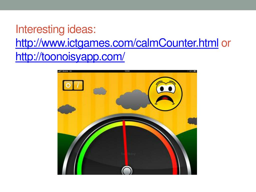 Interestingideas: http://www.ictgames.com/calmCounter.htmlorhttp://toonoisyapp.com/