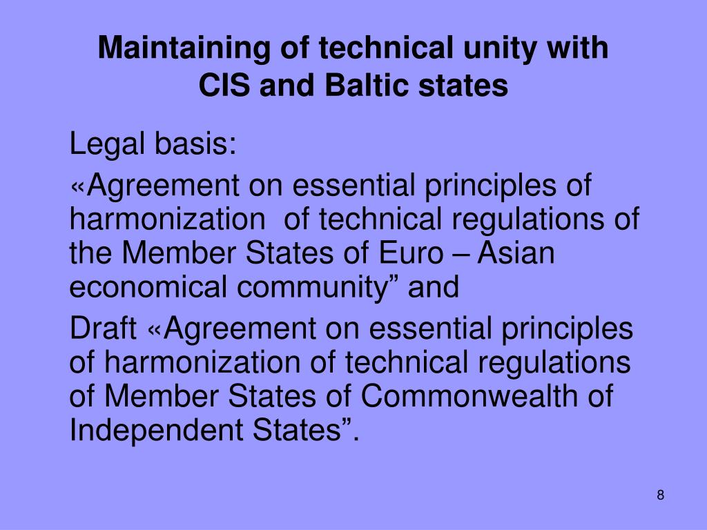 Maintaining of technical unity withCIS and Baltic states Legal basis: «Agreement on essential principles of harmonization of technical regulations of the Member States of Euro– Asian economical community” and Draft «Agreement on essential principles of harmonization of technical regulations of Member States of Commonwealth of Independent States”.