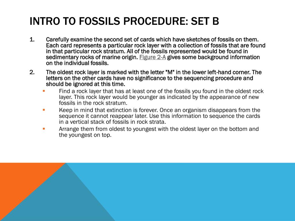 Intro to Fossils Procedure: Set B • Carefully examine the second set of cards which have sketches of fossils on them. Each card represents a particular rock layer with a collection of fossils that are found in that particular rock stratum. All of the fossils represented would be found in sedimentary rocks of marine origin. Figure 2-A gives some background information on the individual fossils. • The oldest rock layer is marked with the letter "M" in the lower left-hand corner. The letters on the other cards have no significance to the sequencing procedure and should be ignored at this time. • Find a rock layer that has at least one of the fossils you found in the oldest rock layer. This rock layer would be younger as indicated by the appearance of new fossils in the rock stratum. • Keep in mind that extinction is forever. Once an organism disappears from the sequence it cannot reappear later. Use this information to sequence the cards in a vertical stack of fossils in rock strata. • Arrange them from oldest to youngest with the oldest layer on the bottom and the youngest on top.