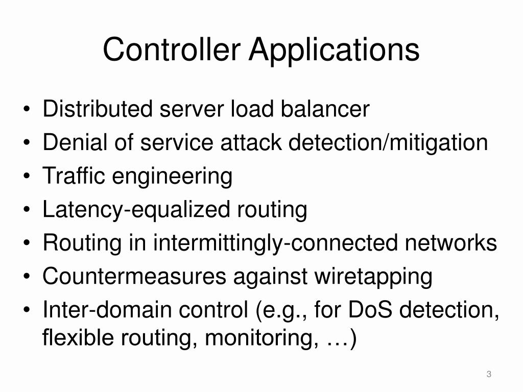 Controller Applications • Distributed server load balancer • Denial of service attack detection/mitigation • Traffic engineering • Latency-equalized routing • Routing in intermittingly-connected networks • Countermeasures against wiretapping • Inter-domain control (e.g., for DoS detection, flexible routing, monitoring, …)