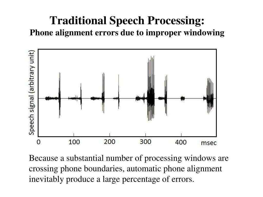 Traditional Speech Processing: Phone alignment errors due to improper windowing Because a substantial number of processing windows are crossing phone boundaries, automatic phone alignment inevitably produce a large percentage of errors.