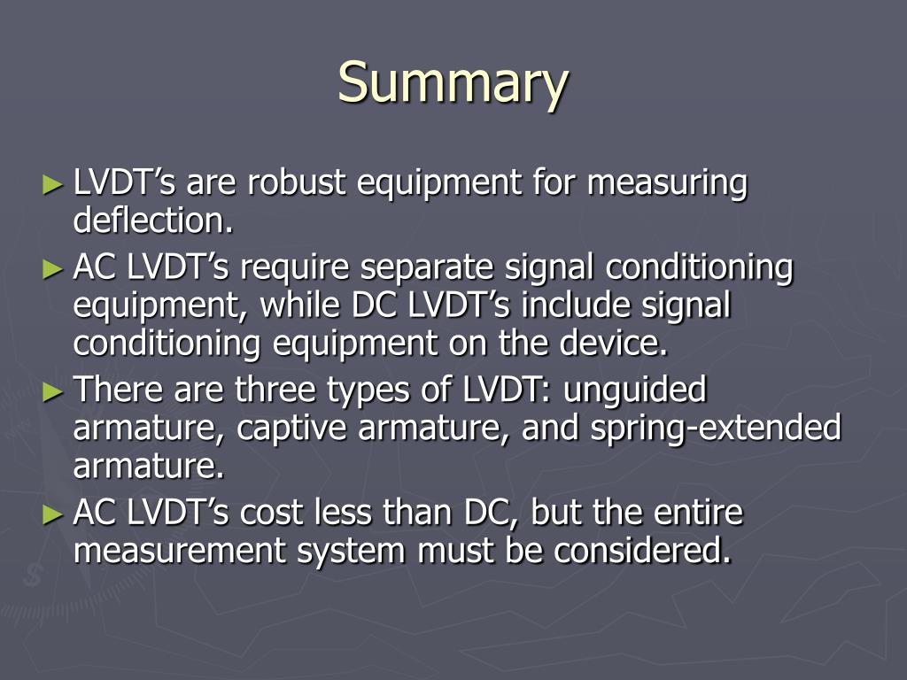 Summary • LVDT’s are robust equipment for measuring deflection. • AC LVDT’s require separate signal conditioning equipment, while DC LVDT’s include signal conditioning equipment on the device. • There are three types of LVDT: unguided armature, captive armature, and spring-extended armature. • AC LVDT’s cost less than DC, but the entire measurement system must be considered.