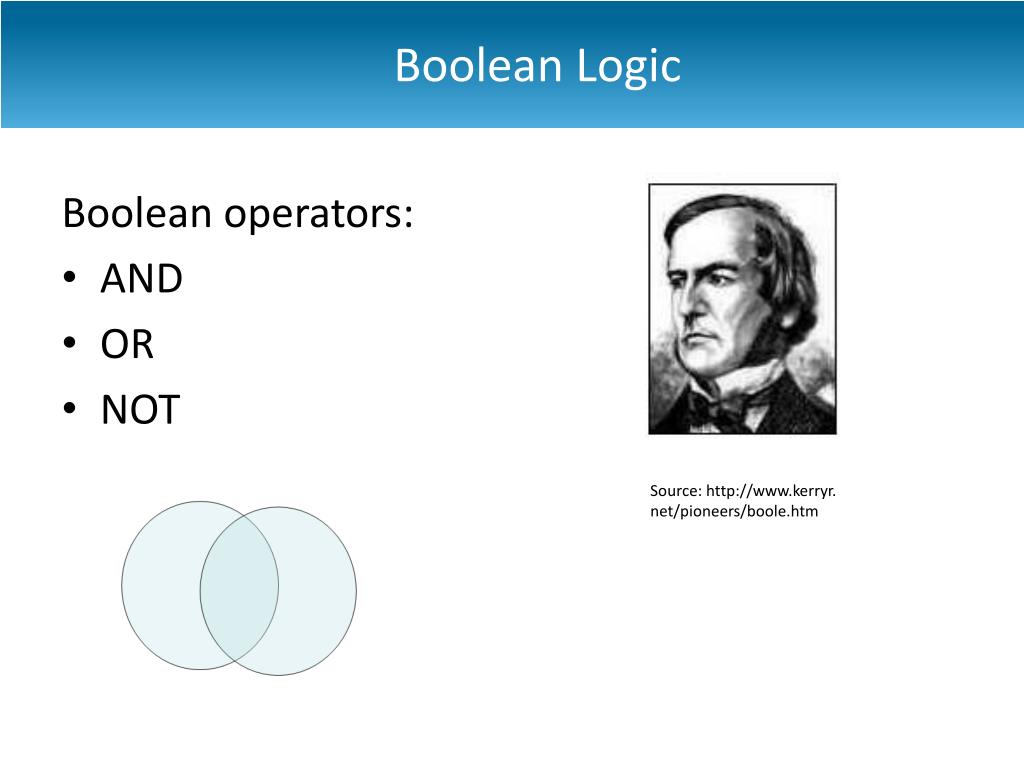 Boolean Logic Boolean operators: • AND • OR • NOT Source: http://www.kerryr.net/pioneers/boole.htm