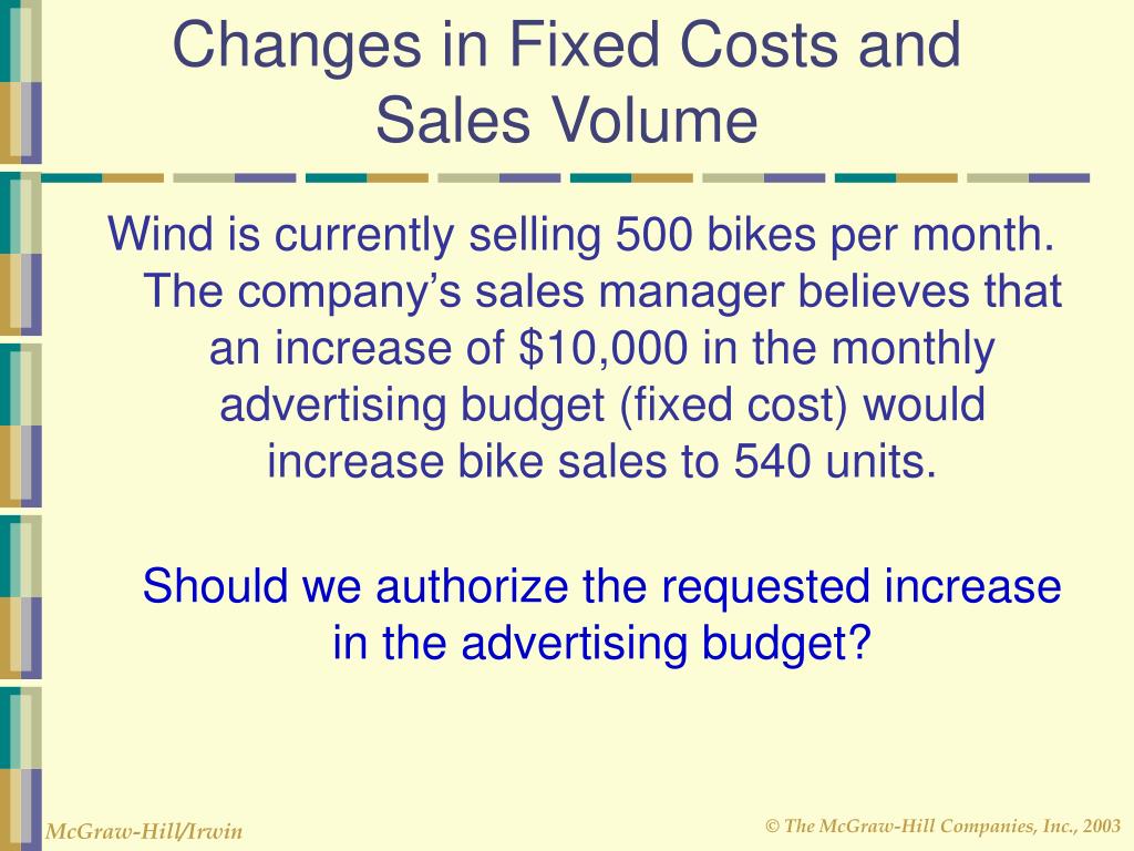 Changes in Fixed Costs and Sales Volume Wind is currently selling 500 bikes per month. The company’s sales manager believes that an increase of $10,000 in the monthly advertising budget (fixed cost) would increase bike sales to 540 units. • Should we authorize the requested increase in the advertising budget?
