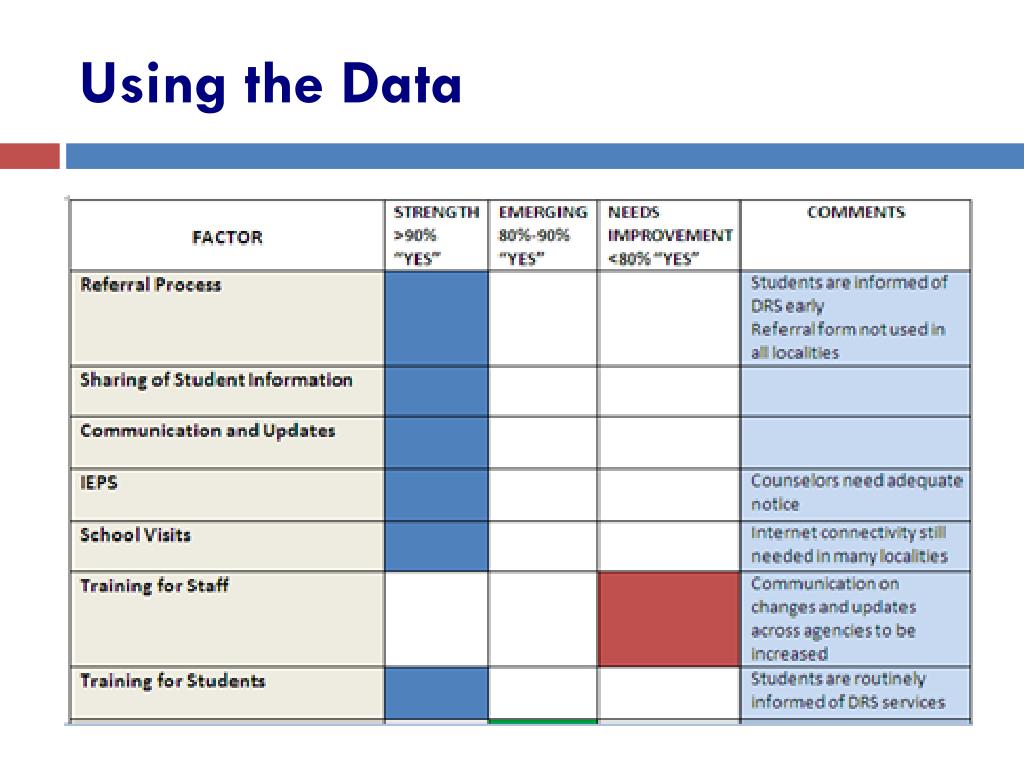 Other Results • Teams introduced after staff turnover • Referral process “debugged” and clarified • Information disseminated • Ideas shared among localities • Example: driver’s permit tutoring • Transition Councils initiated • Programs replicated • Process “mentors” identified