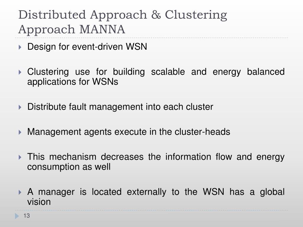 Distributed Approach & Clustering Approach MANNA • Design for event-driven WSN • Clustering use for building scalable and energy balanced applications for WSNs • Distribute fault management into each cluster • Management agents execute in the cluster-heads • This mechanism decreases the information flow and energy consumption as well • A manager is located externally to the WSN has a global vision