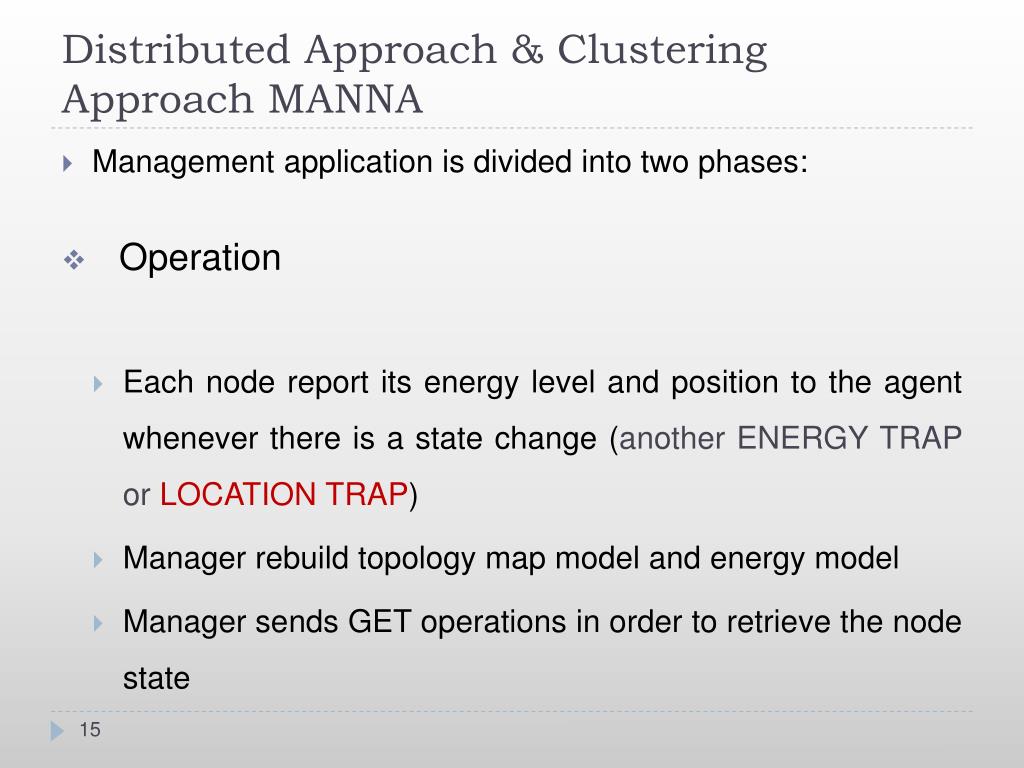 Distributed Approach & Clustering Approach MANNA • Management application is divided into two phases: • Operation • Each node report its energy level and position to the agent whenever there is a state change (another ENERGY TRAP or LOCATION TRAP) • Manager rebuild topology map model and energy model • Manager sends GET operations in order to retrieve the node state