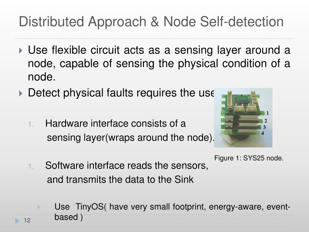 Distributed Approach & Node Self-detection • Use flexible circuit acts as a sensing layer around a node, capable of sensing the physical condition of a node. • Detect physical faults requires the use: • Hardware interface consists of a sensing layer(wraps around the node). • Software interface reads the sensors, and transmits the data to the Sink • Use TinyOS( have very small footprint, energy-aware, event-based ) Figure 1: SYS25 node.