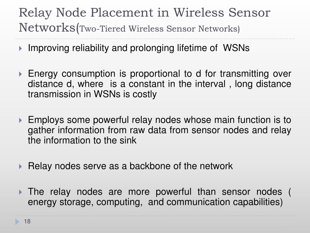 Relay Node Placement in Wireless Sensor Networks(Two-Tiered Wireless Sensor Networks) • Improving reliability and prolonging lifetime of WSNs • Energy consumption is proportional to d for transmitting over distance d, where is a constant in the interval , long distance transmission in WSNs is costly • Employs some powerful relay nodes whose main function is to gather information from raw data from sensor nodes and relay the information to the sink • Relay nodes serve as a backbone of the network • The relay nodes are more powerful than sensor nodes ( energy storage, computing, and communication capabilities)