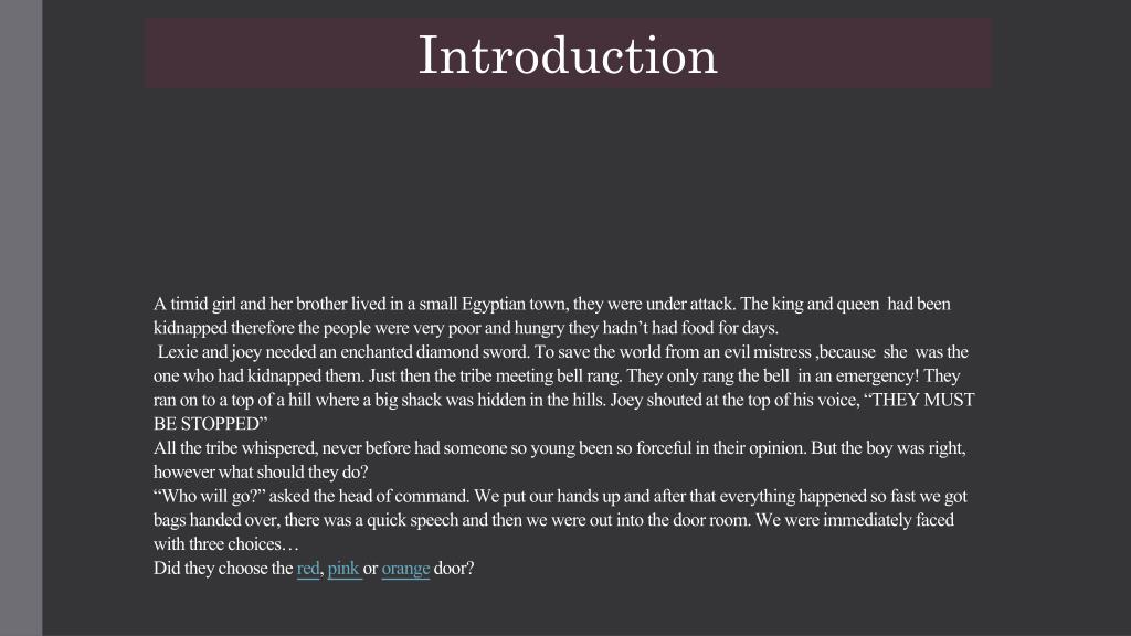 Introduction A timid girl and her brother lived in a small Egyptian town, they were under attack. The king and queen had been kidnapped therefore the people were very poor and hungry they hadn’t had food for days. Lexie and joey needed an enchanted diamond sword. To save the world from an evil mistress ,because she was the one who had kidnapped them. Just then the tribe meeting bell rang. They only rang the bell in an emergency! They ran on to a top of a hill where a big shack was hidden in the hills. Joey shouted at the top of his voice, “THEY MUST BE STOPPED” All the tribe whispered, never before had someone so young been so forceful in their opinion. But the boy was right, however what should they do?“Who will go?” asked the head of command. We put our hands up and after that everything happened so fast we got bags handed over, there was a quick speech and then we were out into the door room. We were immediately faced with three choices… Did they choose the red, pink or orangedoor?