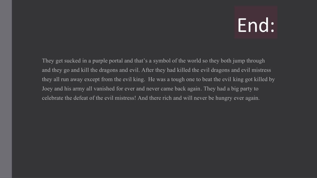 End: They get sucked in a purple portal and that’s a symbol of the world so they both jump through and they go and kill the dragons and evil. After they had killed the evil dragons and evil mistress they all run away except from the evil king. He was a tough one to beat the evil king got killed by Joey and his army all vanished for ever and never came back again. They had a big party to celebrate the defeat of the evil mistress! And there rich and will never be hungry ever again.