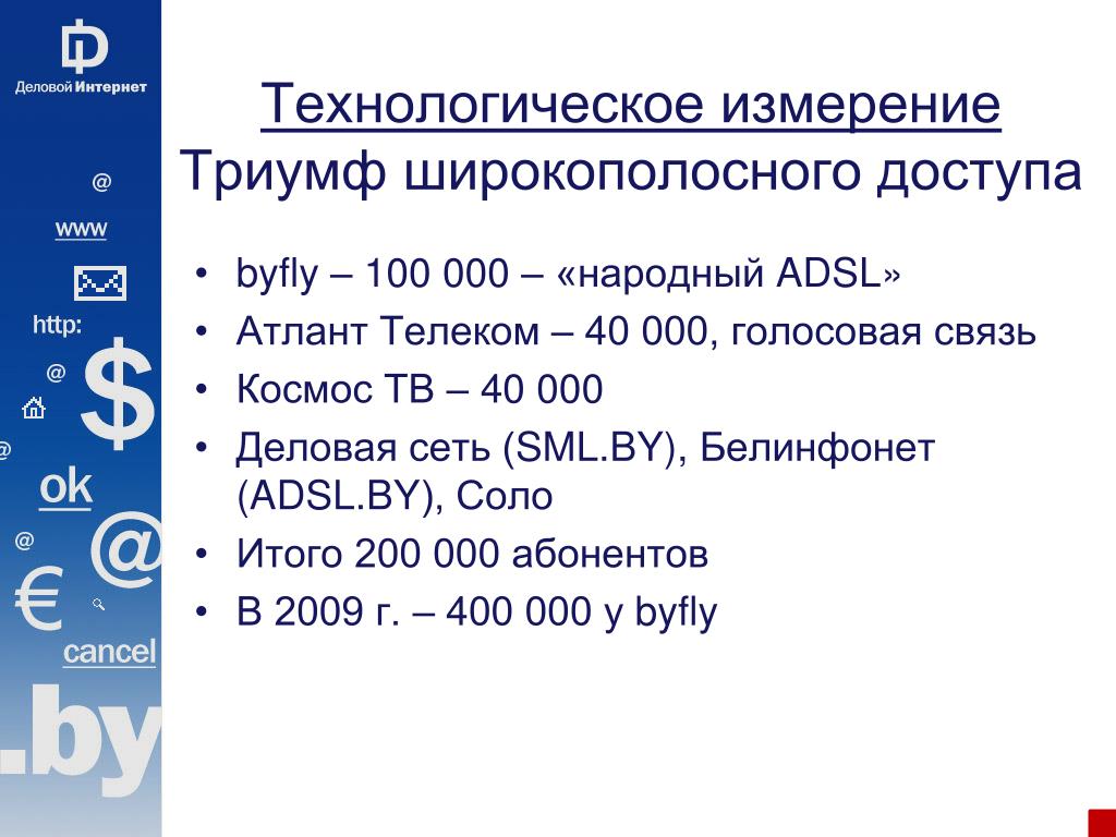 Технологическое измерениеТриумф широкополосного доступа • byfly – 100 000 – «народный ADSL» • АтлантТелеком – 40 000, голосовая связь • Космос ТВ– 40 000 • Деловая сеть (SML.BY), Белинфонет (ADSL.BY), Соло • Итого200 000 абонентов • В 2009 г. – 400 000 у byfly