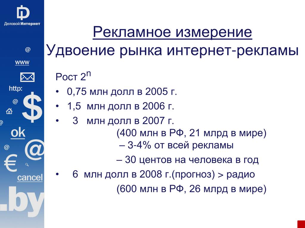 Рекламное измерениеУдвоение рынка интернет-рекламы Рост 2n • 0,75 млн долл в 2005 г. • 1,5 млн долл в 2006 г. • 3 млн долл в 2007 г. (400 млн в РФ, 21 млрд в мире) – 3-4% от всей рекламы – 30 центов на человека в год • 6 млн долл в 2008 г.(прогноз) > радио (600 млн в РФ, 26 млрд в мире)